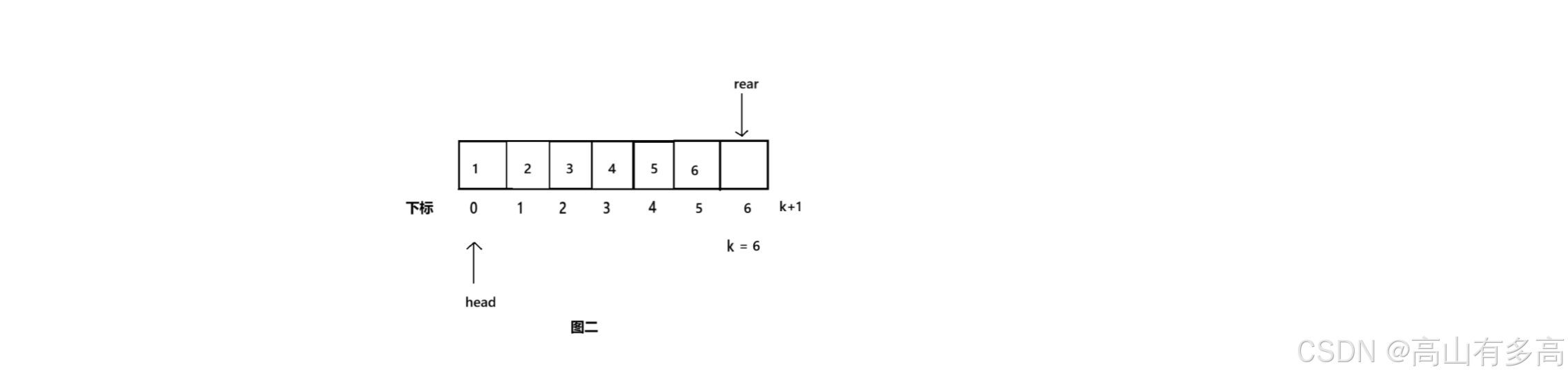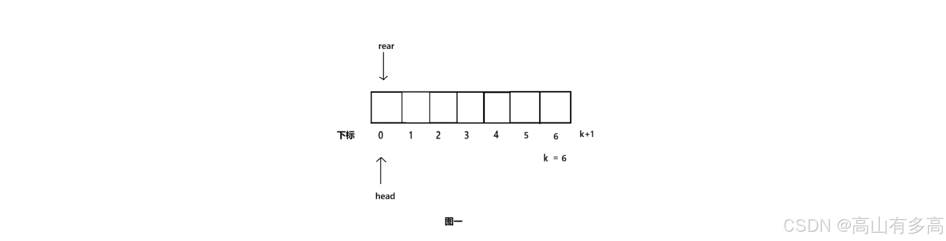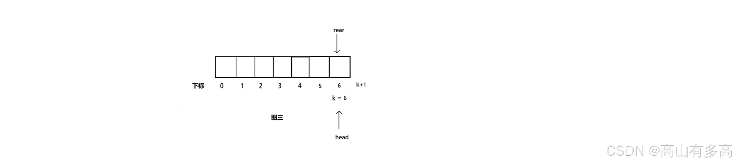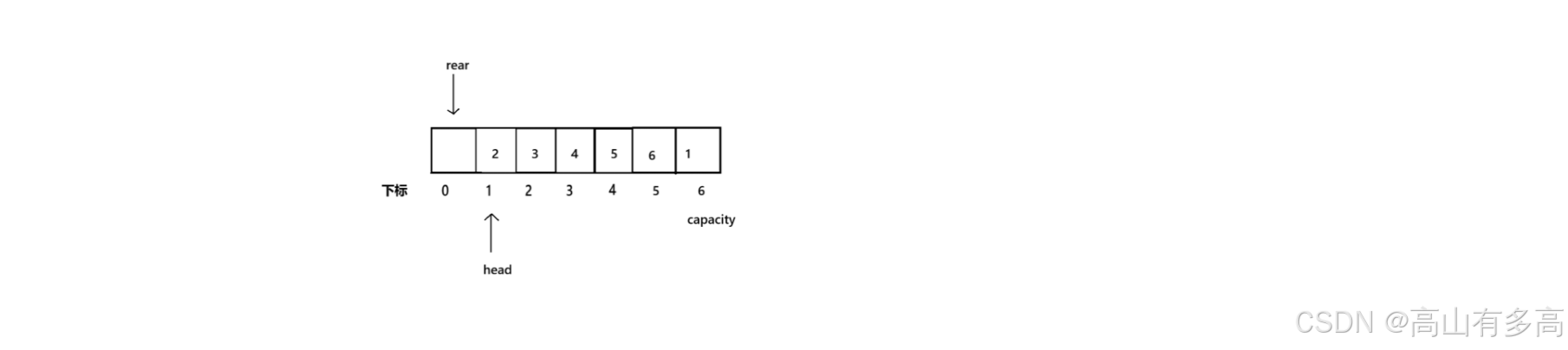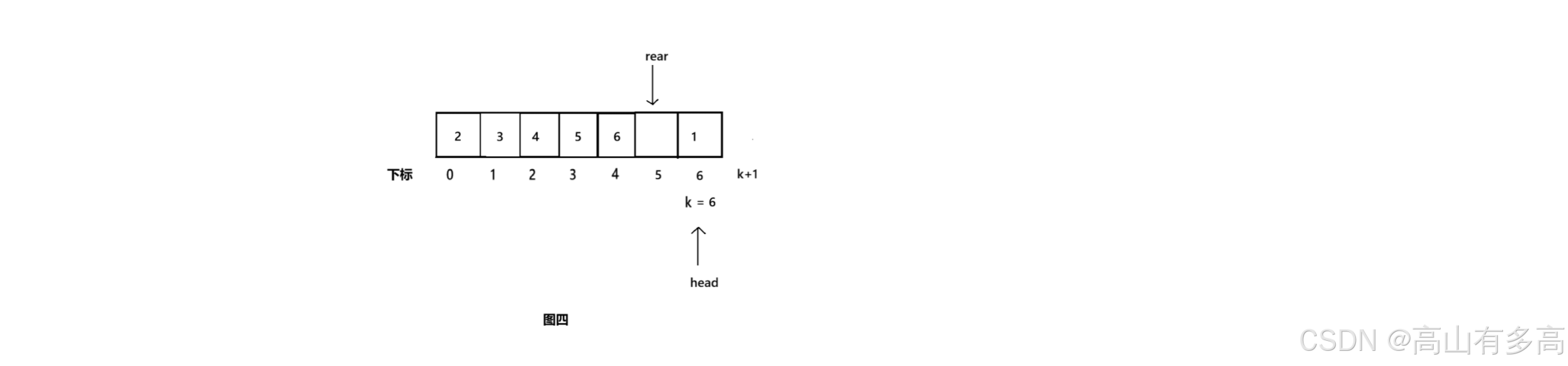 ③如图所示:对于特殊情况,rear指向下标为0的位置时,此时队尾元素的下标不再是rear-1,队尾元素的下标为:rear->capacity,其中capacity为空间可用空间容量。