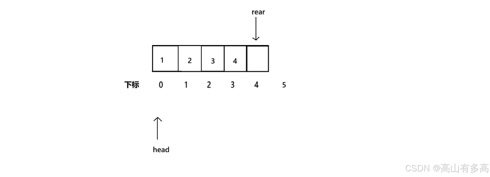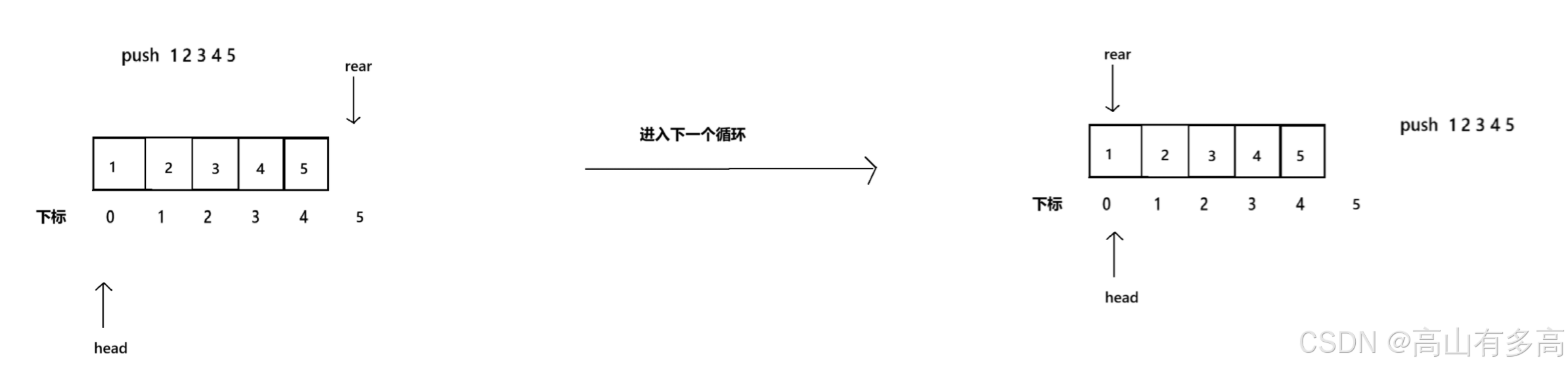 如图所示:在物理结构上循环队列是基于数组实现的,若rear到达数组末尾,进入下一个循环。