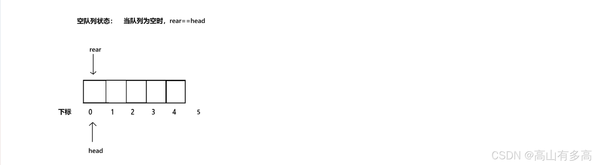 如图所示:当队列为空时,队头指针和队尾指针都指向同一个位置,所以用rear==head来判断。