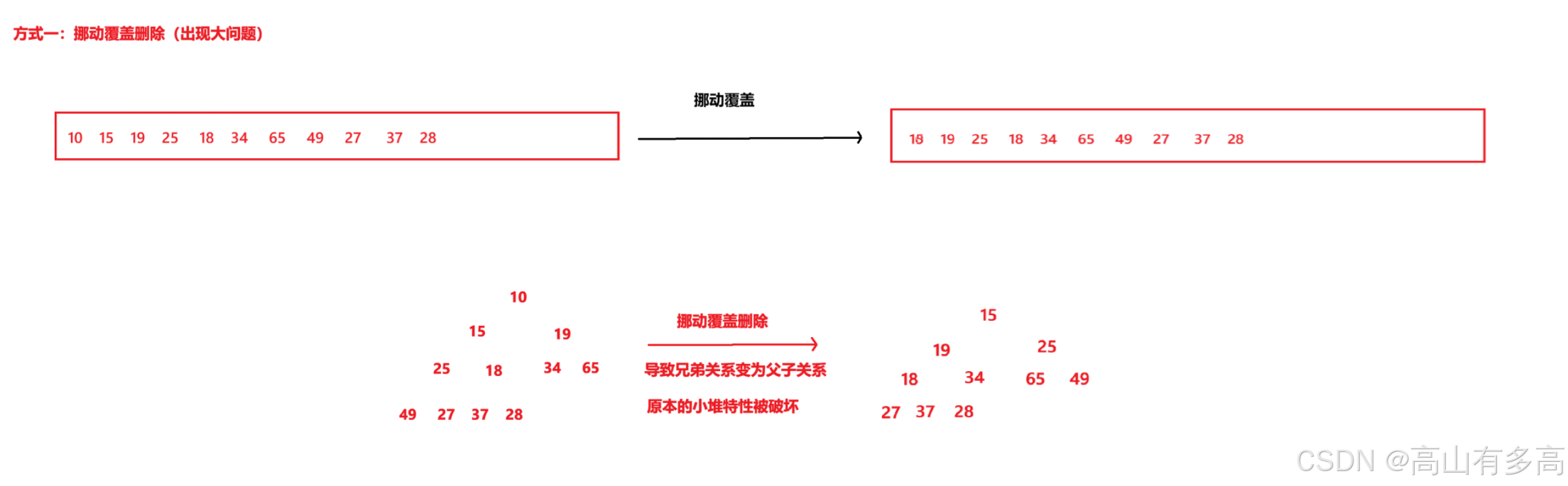 对于堆的删除,我们进行的是删除堆顶元素后,依然维持堆的结构,如果采用暴力的挪动覆盖删除: