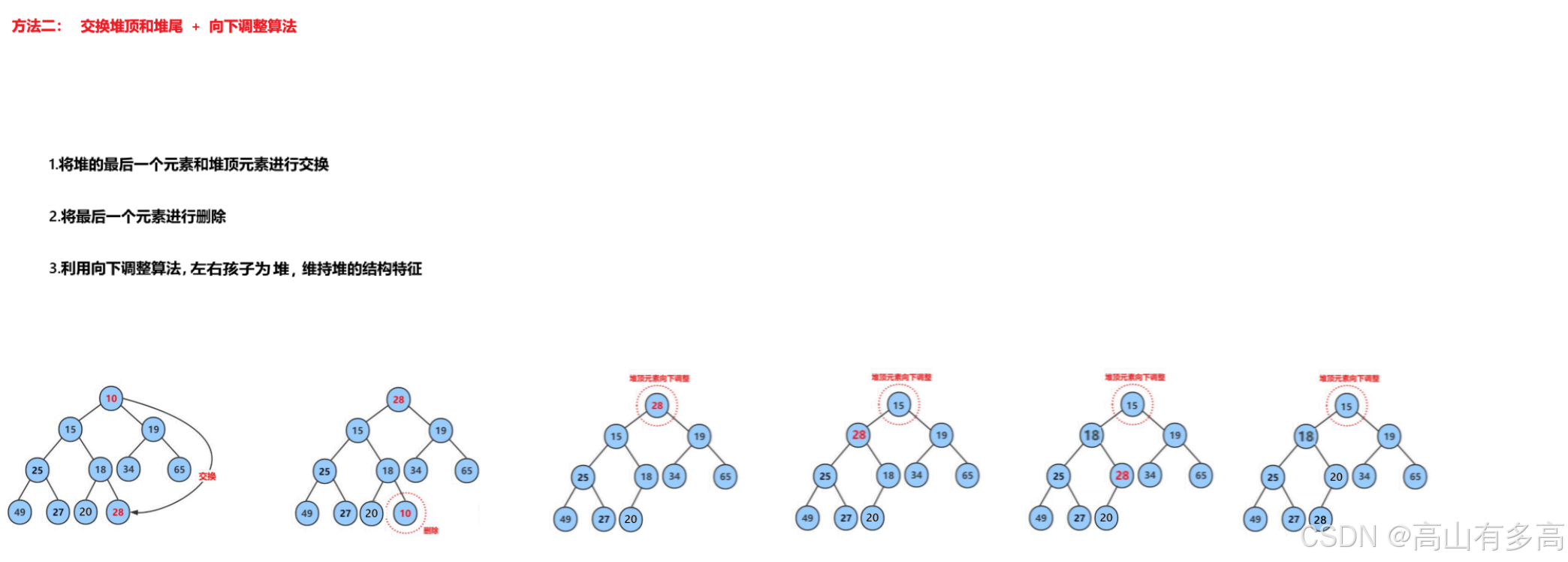 对于堆的删除,我们可以通过交换+向下调整的方式: