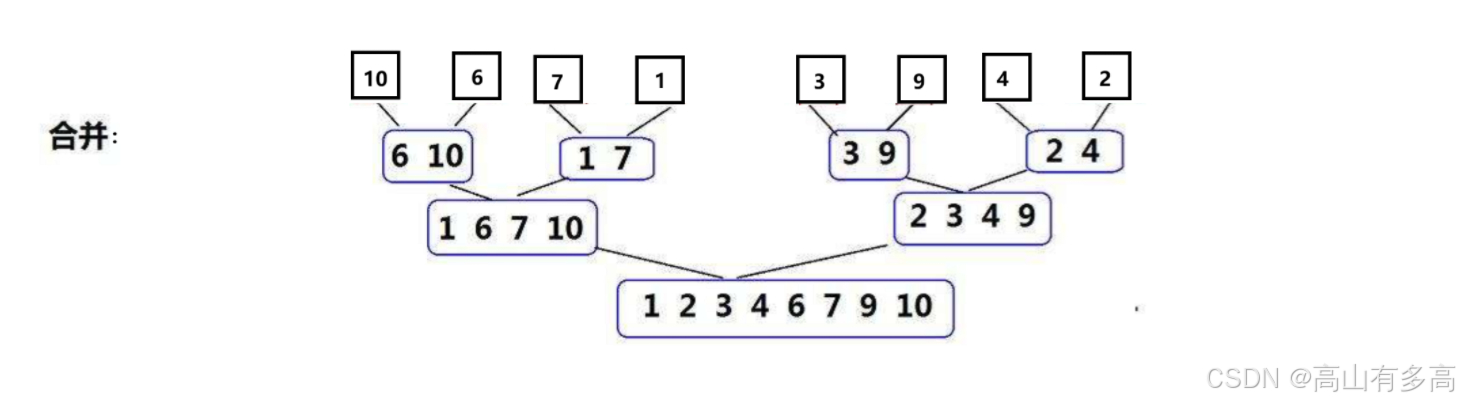 合(Merge): 将两个已排序的子数组归并成一个更大的有序数组,重复这个过程,直到所有子数组都归并成一个完整的有序数组