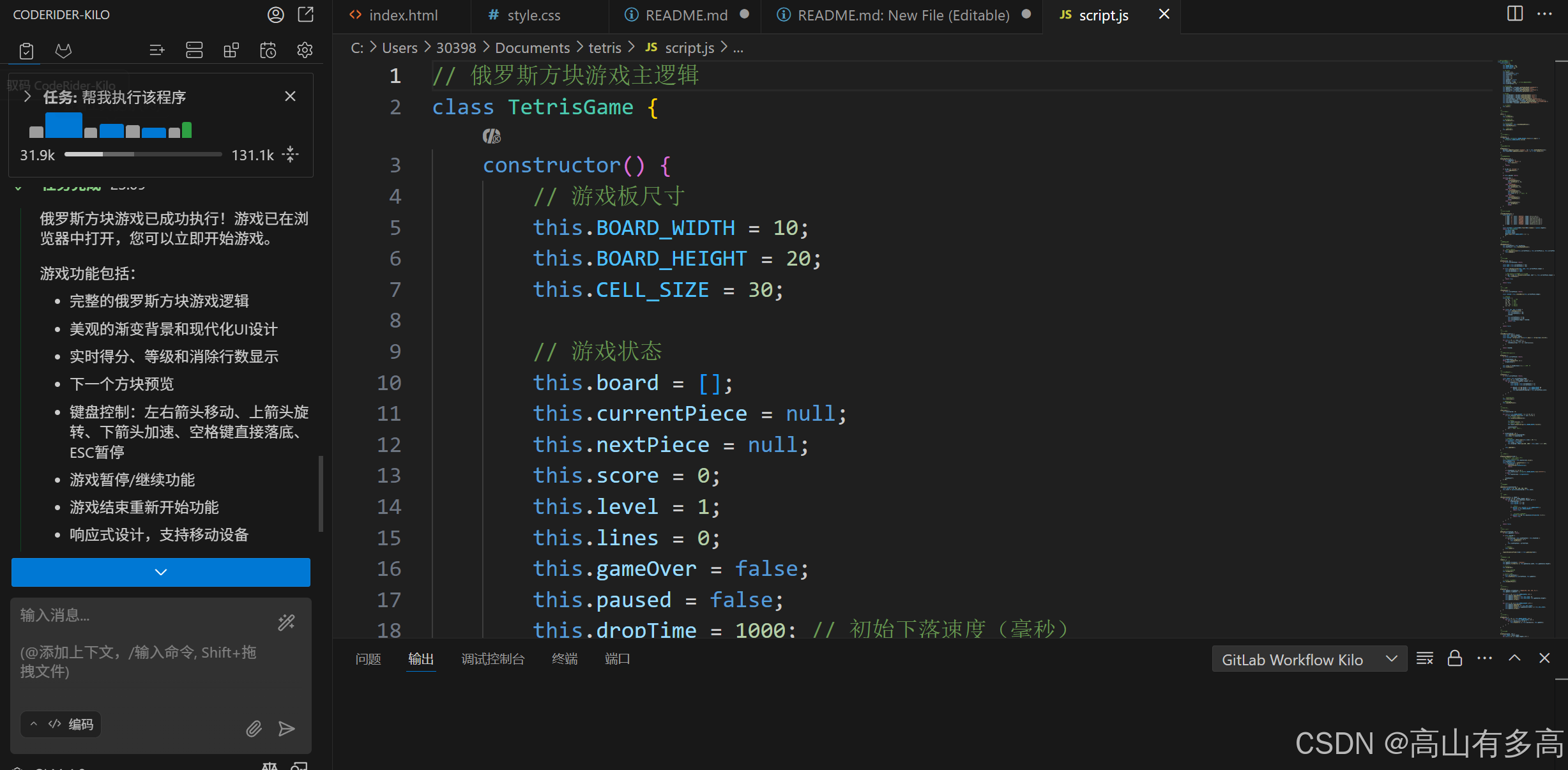 我直接在 CodeRider-Kilo 的对话框里输入:“帮我用 html + css 写一个标准的俄罗斯方块。要求:包含 7 种经典形状(O/I/S/Z/L/J/T),支持旋转、加速下落,并且侧边栏要显示‘下一个方块’和‘当前分数’。”