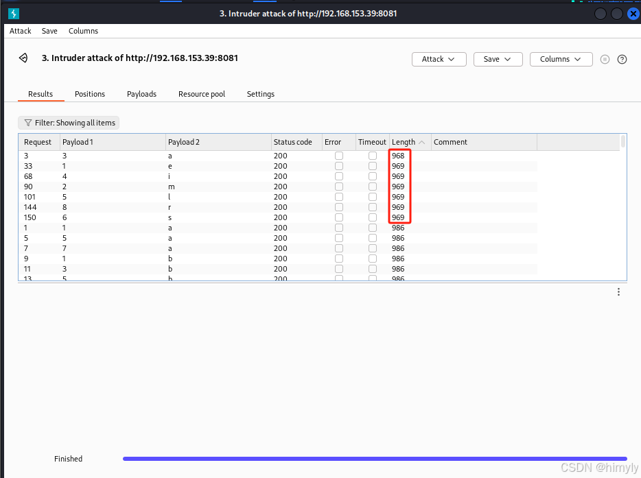 爆破完成,根据位数进行排序,这里没有第七位的原因是第七位是逗号,而字典中没有逗号,所以没有显示,第七位之前就是第一个表单名emails,要想爆破后续名单名字就需要补全数字和字典
