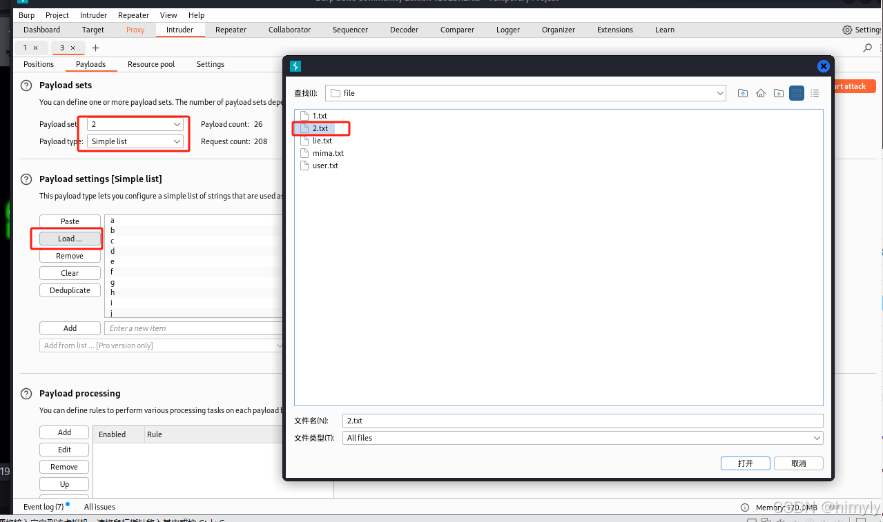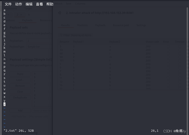 接下来我们使用bp爆破其他的字符,这里我使用的是kali上的bp,先创建一个36位字母的字典