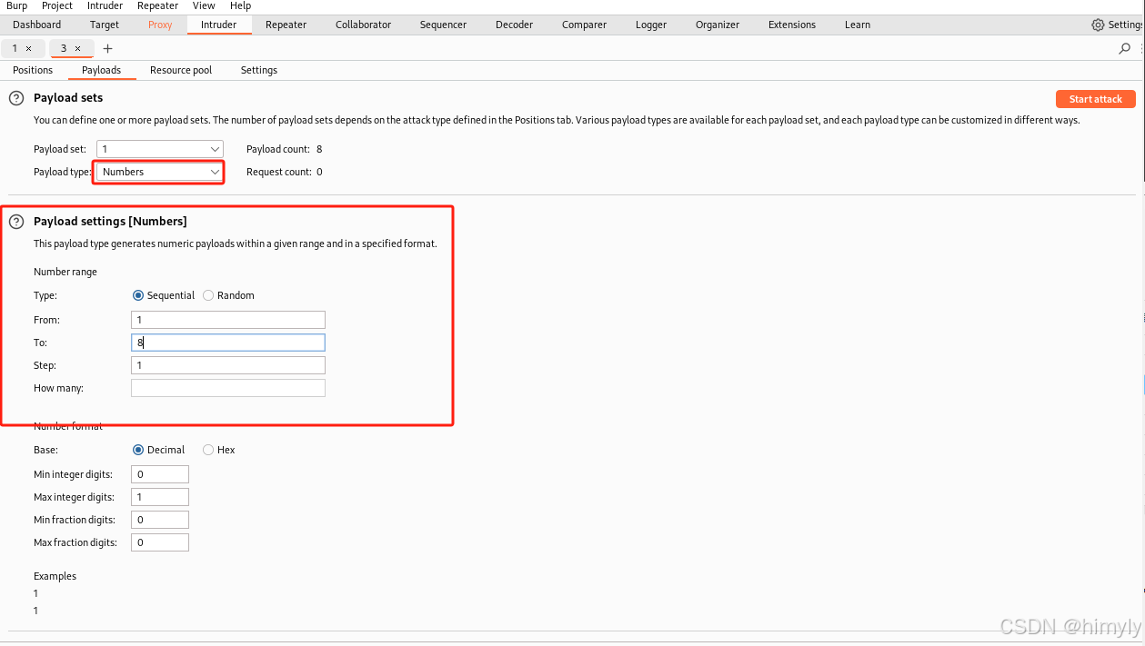 设置payload,第一个攻击节点设置为数字型,数据库长度为8,所以我们设置长度为8步长为1