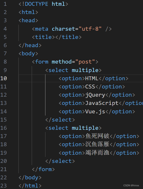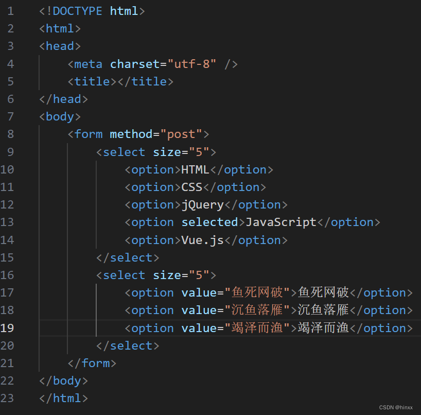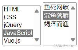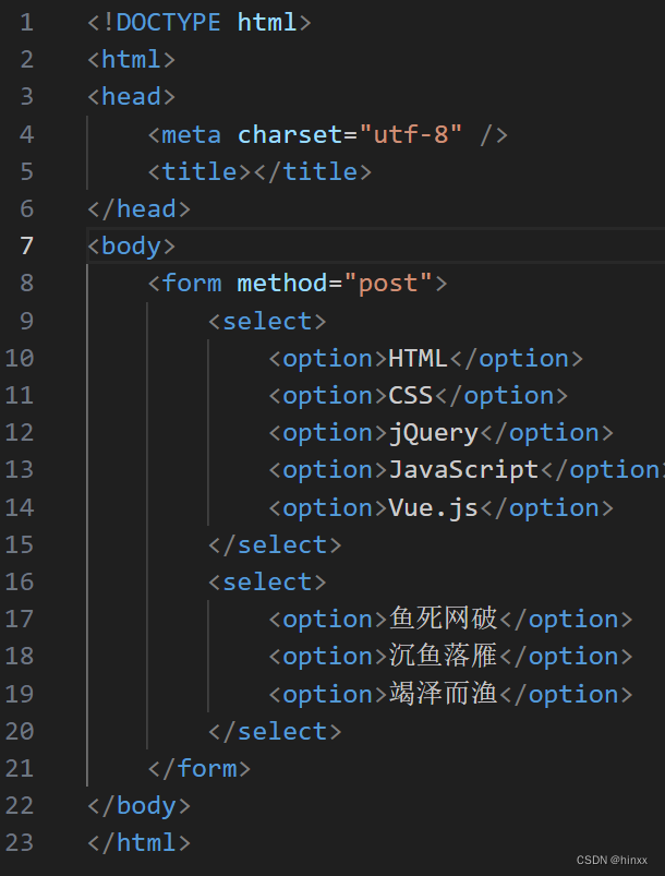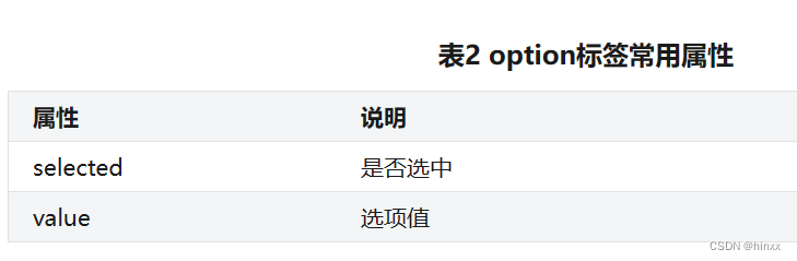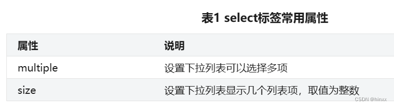 <select> <option>选项内容</option> …… <option>选项内容</option> </select>