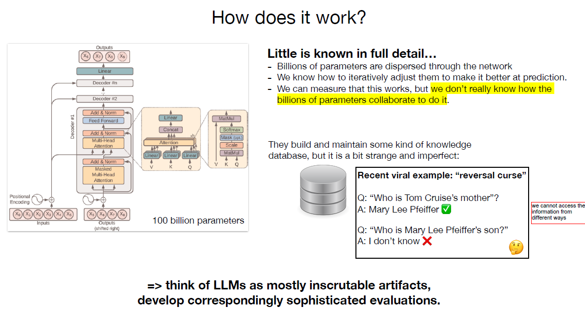 3. 大模型存储了海量的信息,但是并不一定支持从不同的角度问相同的问题。这张幻灯片里,提问汤姆克鲁斯的妈妈是谁,大模型回答了Mary Lee Pfeifeer。但是我们再问大模型,Mary Lee Pfeifeer的儿子是谁,大模型就不知道了。