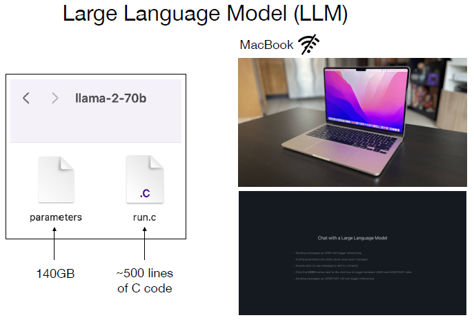 - 大模型运行起来只需要两个文件,140GB的参数文件和500行的C代码,参见llama.cpp.