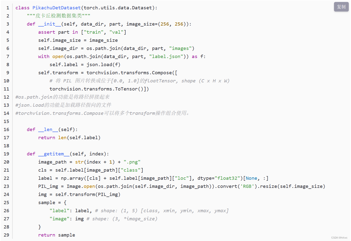 首先定义一个数据集类PikachuDetDataset,数据集每个样本包含label和image。label是一个m×5m×5 的向量,即m个边界框,每个边界框由[class, x_min, y_min, x_max, y_max]表示,这里的皮卡丘数据集中每个图像只有一个边界框,因此m=1。image是一个所有元素都位于[0.0, 1.0]的浮点tensor,代表图片数据。