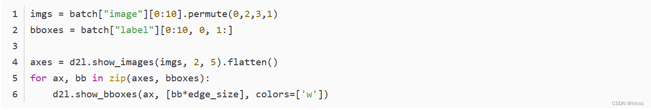 - 目标检测的数据读取跟图像分类的类似。然而,在引入边界框后,标签形状和图像增广(如随机裁剪)发生了变化。