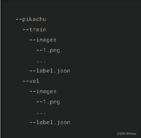 皮卡丘数据集使用MXNet提供的im2rec工具将图像转换成了二进制的RecordIO格式,但是我们后续要使用PyTorch,所以我们先用脚本将其转换成了PNG图片并用json文件存放对应的label信息。最终pikachu文件夹的结构如下: