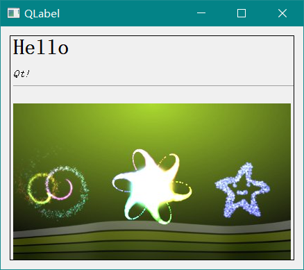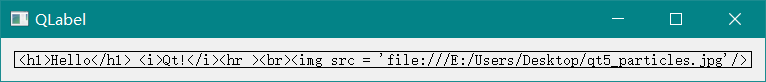 QString str = "<h1>Hello</h1> <i>Qt!</i>" "<hr ><br>" "<img src = 'file:///E:/Users/Desktop/qt5_particles.jpg'/>"; label0->setText( str); label0->setTextFormat (Qt::PlainText); -