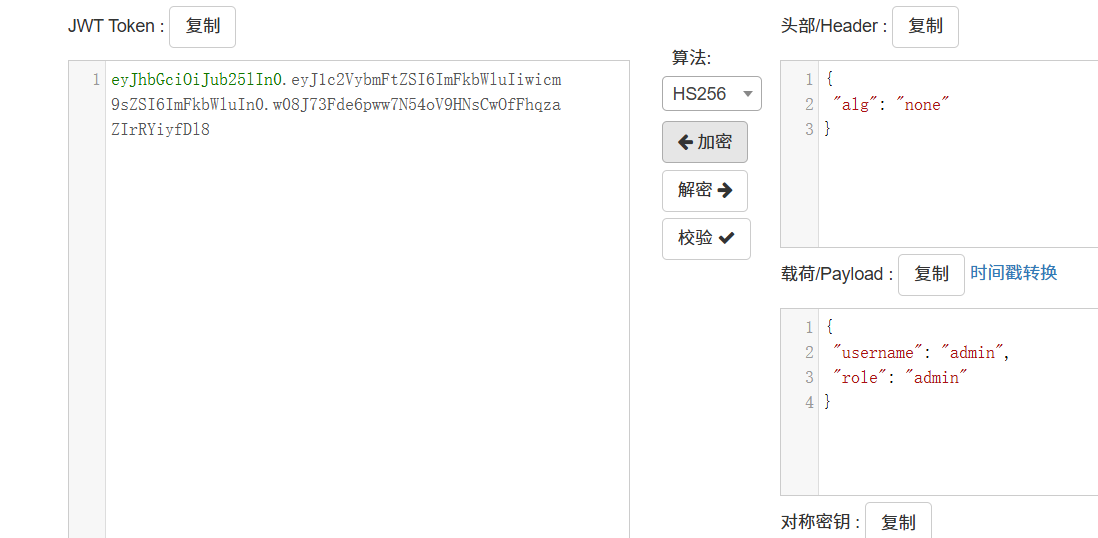 Authorization:eyJhbGciOiJub25lIn0.eyJ1c2VybmFtZSI6ImFkbWluIiwicm9sZSI6ImFkbWluIn0.w08J73Fde6pww7N54oV9HNsCwOfFhqzaZIrRYiyfDl8