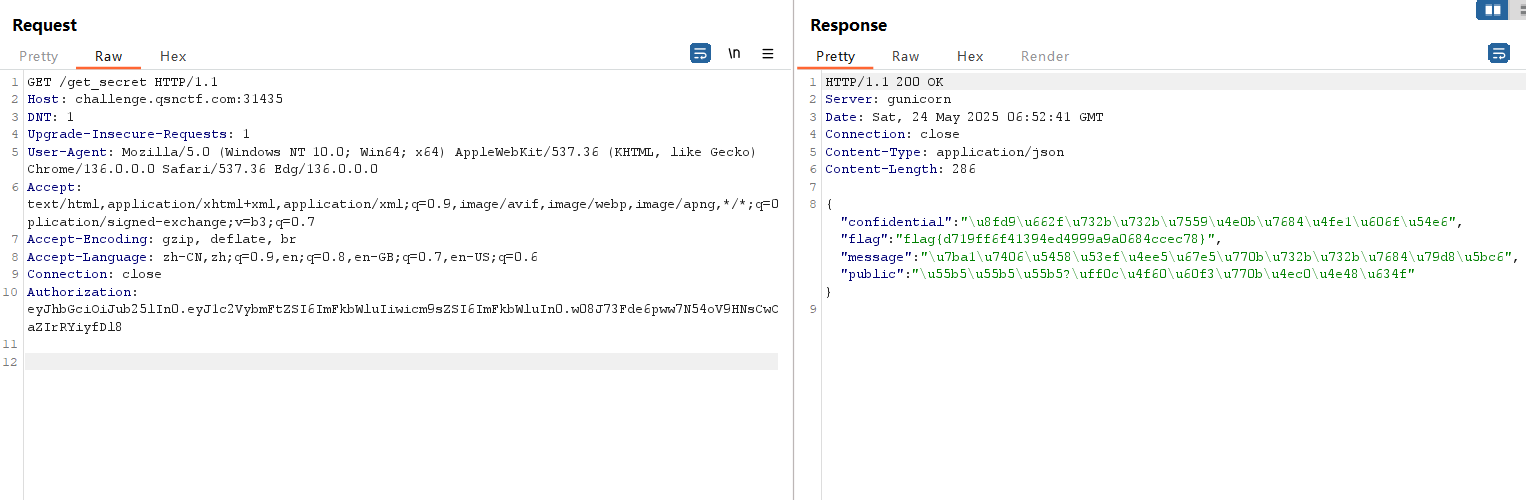 然后使用burpsuite拦截url/get_secret页面,在请求包加上