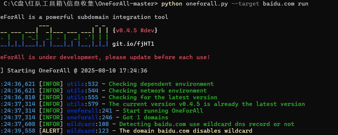 # 全模式枚举(被动+主动) python oneforall.py --target target.com run