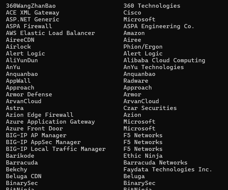 - 功能:识别目标是否部署 WAF(如 Cloudflare、AWS WAF),并判断厂商。