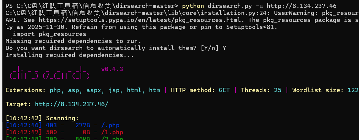 /admin、index.php),支持 多线程、自定义字典、响应过滤(排除 404/403)。 - 原理: