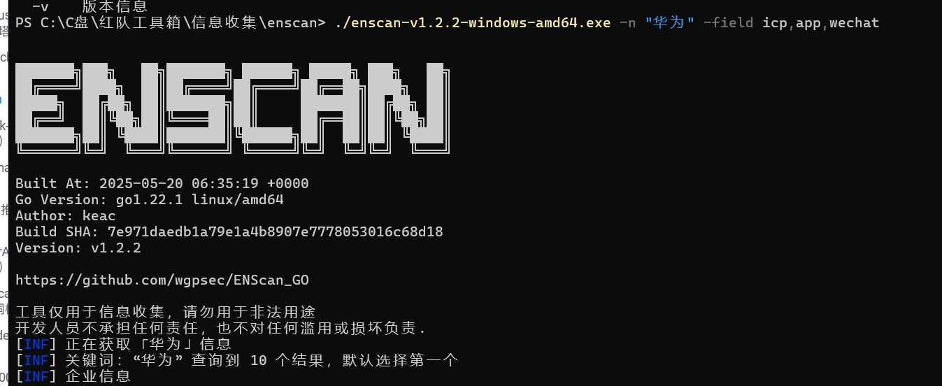 ./enscan-v1.2.2-windows-amd64.exe -n "华为" -field icp,app,wechat # 获取备案、APP和公众号信息