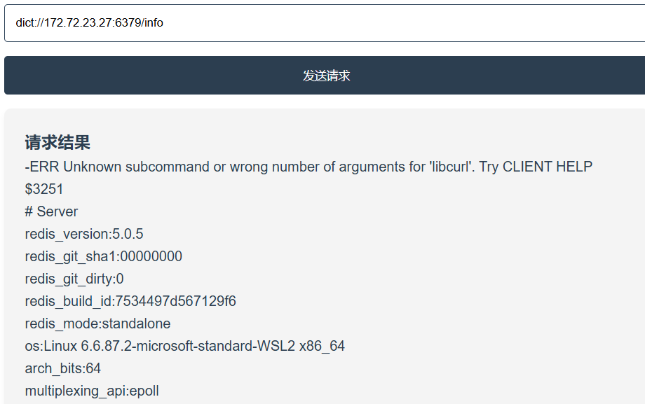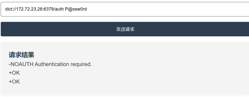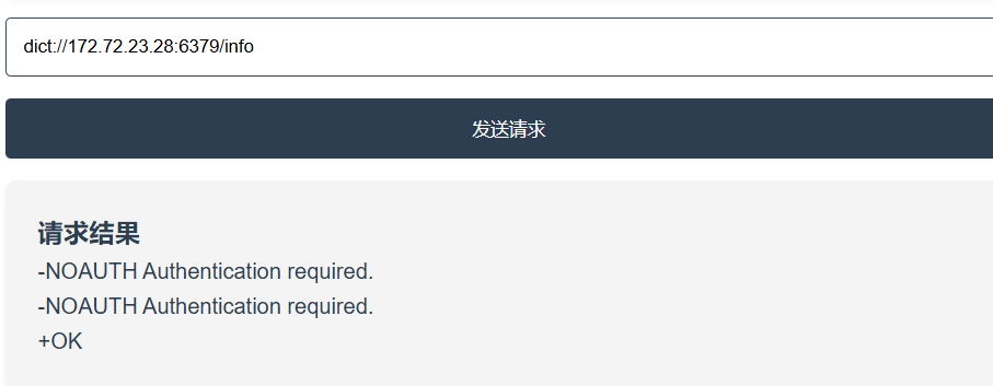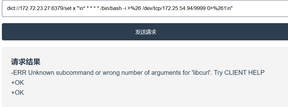 发现不能够进行get条件,说明没有web服务,也没有其它的写入功能,但是记住这是SSRF漏洞,那么就可以使用dict协议,dict协议除了可以探测端口以外,另一个方面就是能够攻击未授权的 Redis 服务了,那么接下来来构造攻击语句。