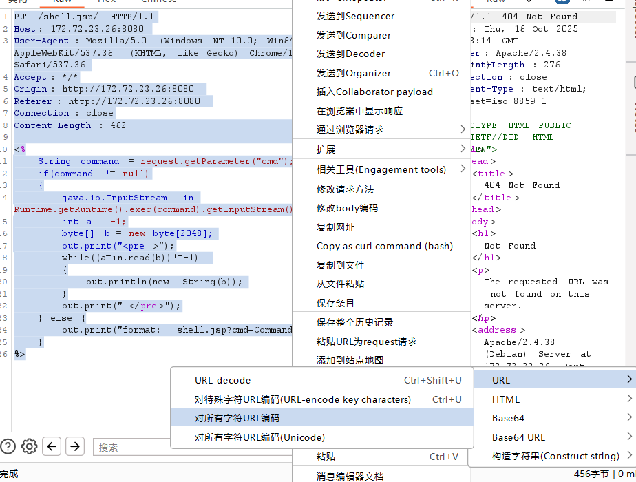 然后再靶场进行抓包,修改相应的请求方法和数据,如下所示(记住一定要在文件后面加上/等,不然会写入失败,因为如果不加上,不支持jsp使用put方式写入)