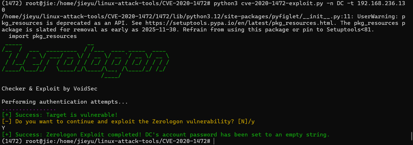 使用 Exploit 脚本置空域控制器计算机账户(DC)的密码哈希(注意:并非域控整体哈希,而是 账户 —— 域控的核心计算机账户)