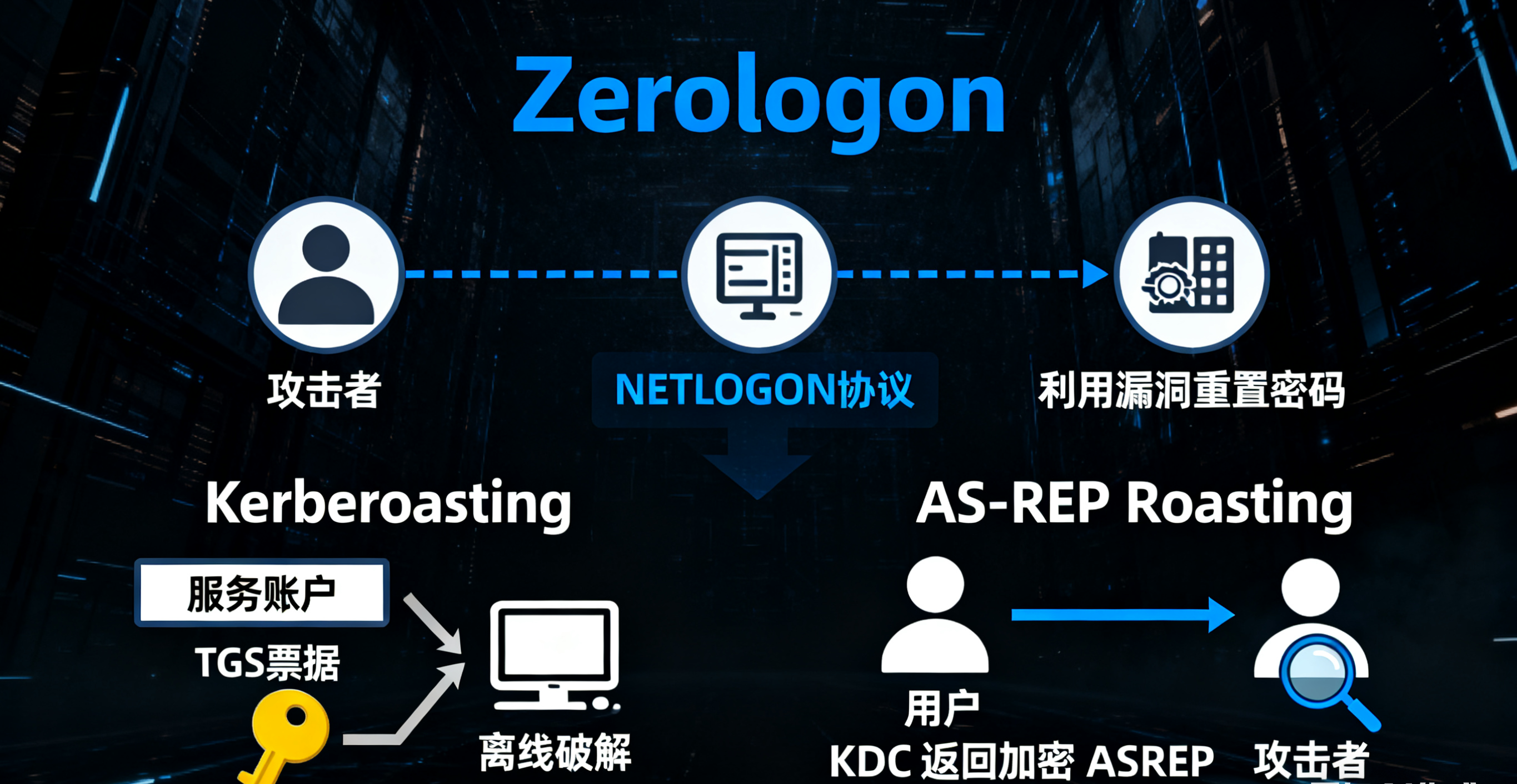 - Kerberoasting 针对服务账户,依赖 SPN 票据离线爆破,核心是字典质量与格式转换;