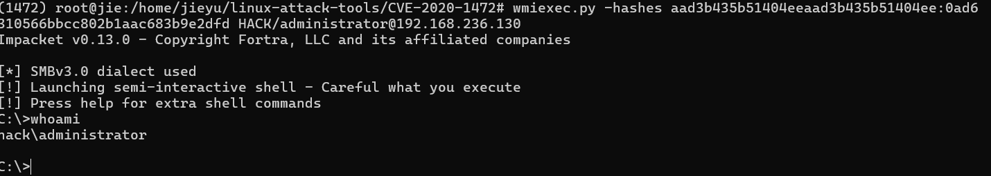 成功,我们在只知道域控制器的主机名和域控制器的IP地址的情况下,获得了域管理员的hash,那么我们就可以正式控制域控制器,比如使用impacket中的wmiexec.py脚本进行登录,使用命令如下