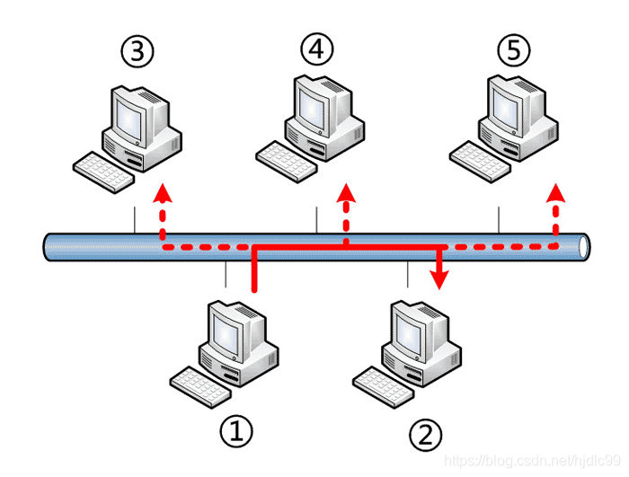 上图中,1号计算机向2号计算机发送一个数据包,同一个子网络的3号、4号、5号计算机都会收到这个包。它们读取这个包的"标头",找到接收方的MAC地址,然后与自身的MAC地址相比较,如果两者相同,就接受这个包,做进一步处理,否则就丢弃这个包。这种发送方式就叫做"广播"(broadcasting)。