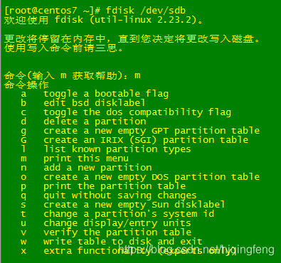 ①进入磁盘管理界面fdisk :#fdisk /dev/sdb