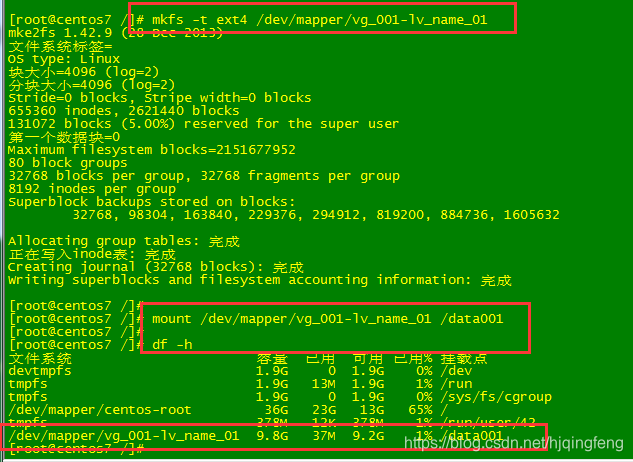 # mkfs -t ext4 /dev/mapper/vg_001-lv_test01 #格式化磁盘