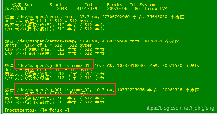 磁盘 /dev/mapper/vg_001-lv_test01:10.7 GB, 10737418240 字节,20971520 个扇区
