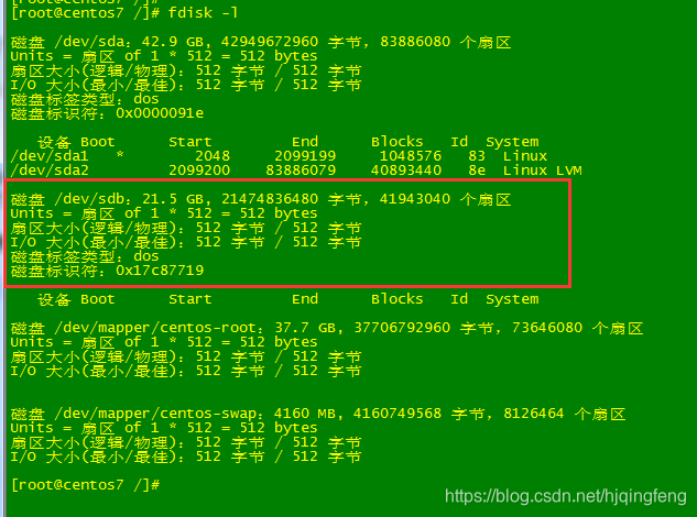 环境:cetnos 7.8 挂了一个20G的盘特意做磁盘分区实验。