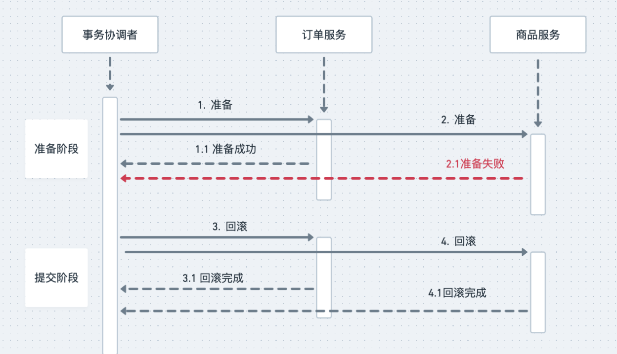 以上是正常情况,接下来才是重点,异常情况怎么办呢?我们还是分两阶段来说明,在准备阶段,如果任何异步出现错误或者超时,协调者就会给两个服务发送回滚事务请求,两个服务在收到请求之后,回滚自己的数据库事务,分布式事务执行失败,两个服务的数据库事务都回滚了,相关的所有数据回滚到分布式事务执行之前的状态,就像这个分布式事务没有执行一样,以下是异常情况的时序图:
