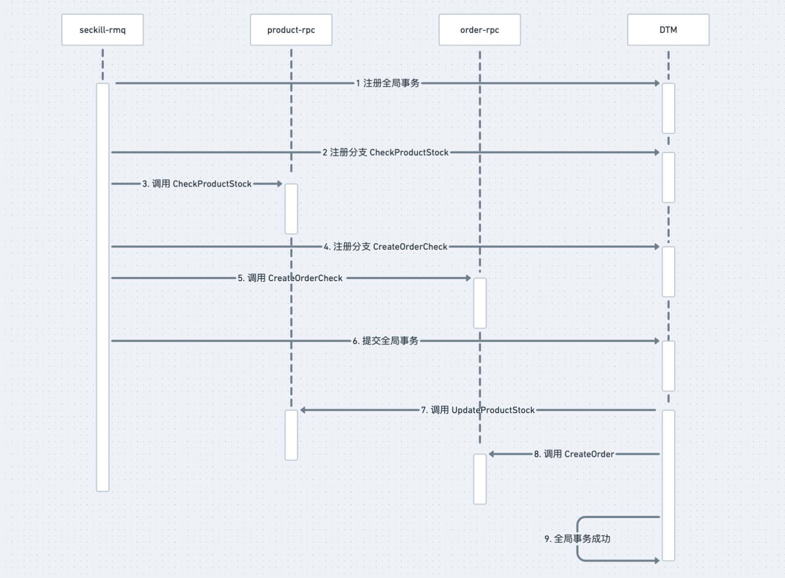 在seckill-rmq中消费到订单数据后进行下单和扣库存操作,这里改成基于TCC的分布式事务方式,注意 dtmServer 和DTM配置文件中的Target对应: