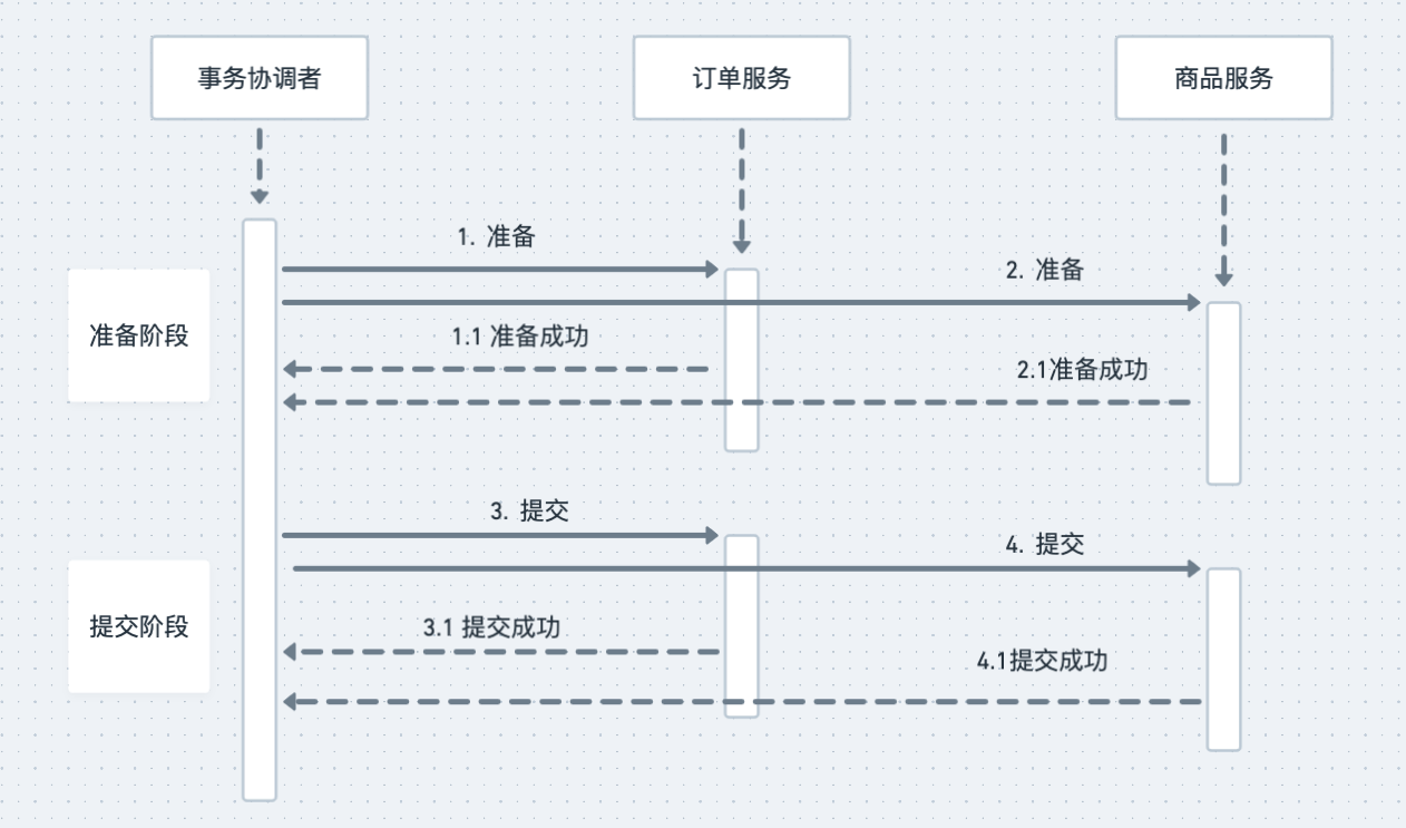 注意这里我们没有提交订单数据库事务,最后给书屋协调者返回准备成功。协调者在收到两个服务准备成功的响应后,开始进入第二阶段。进入提交阶段,提交阶段就比较简单了,协调者再给这两个系统发送提交命令,每个系统提交自己的数据库事务然后给协调者返回提交成功响应,协调者收到有响应之后,给客户端返回成功的响应,整个分布式事务就结束了,以下是这个过程的时序图: