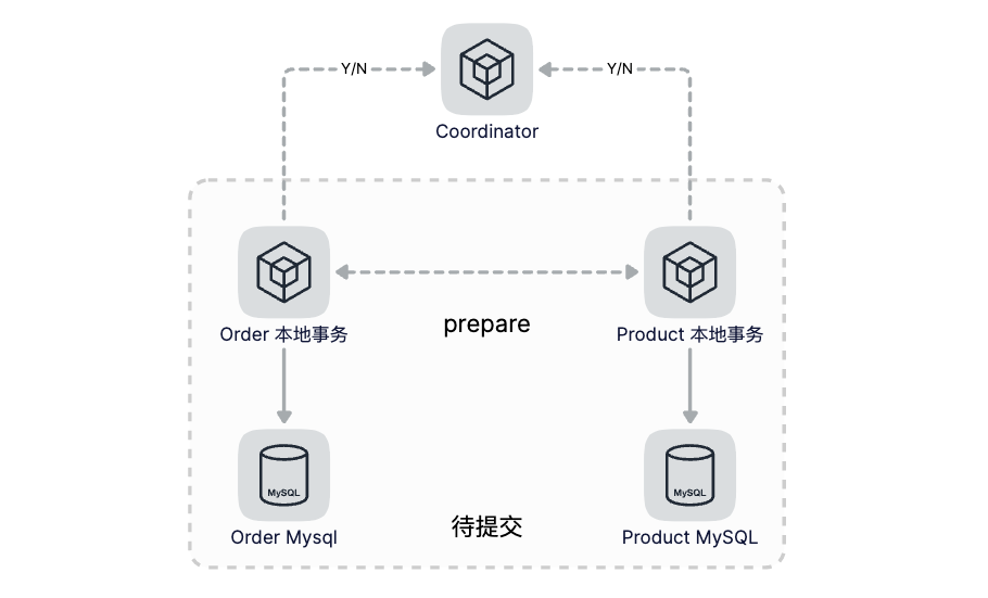 第一步(Prepare):Coordinator向各个分布式事务的参与者下达Prepare指令,各个事务分别将SQL语句在数据库执行但不提交,并且将准备就绪状态上报给Coordinator。