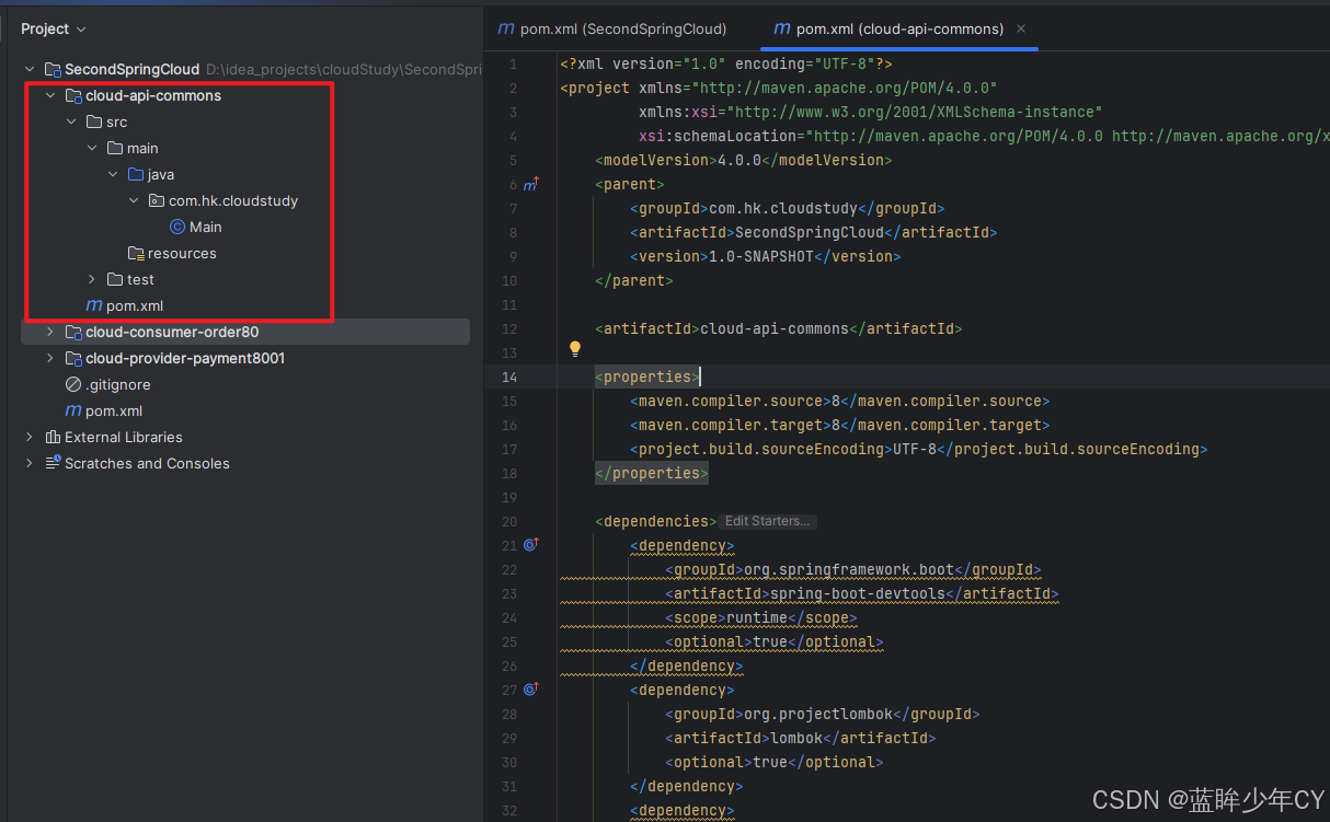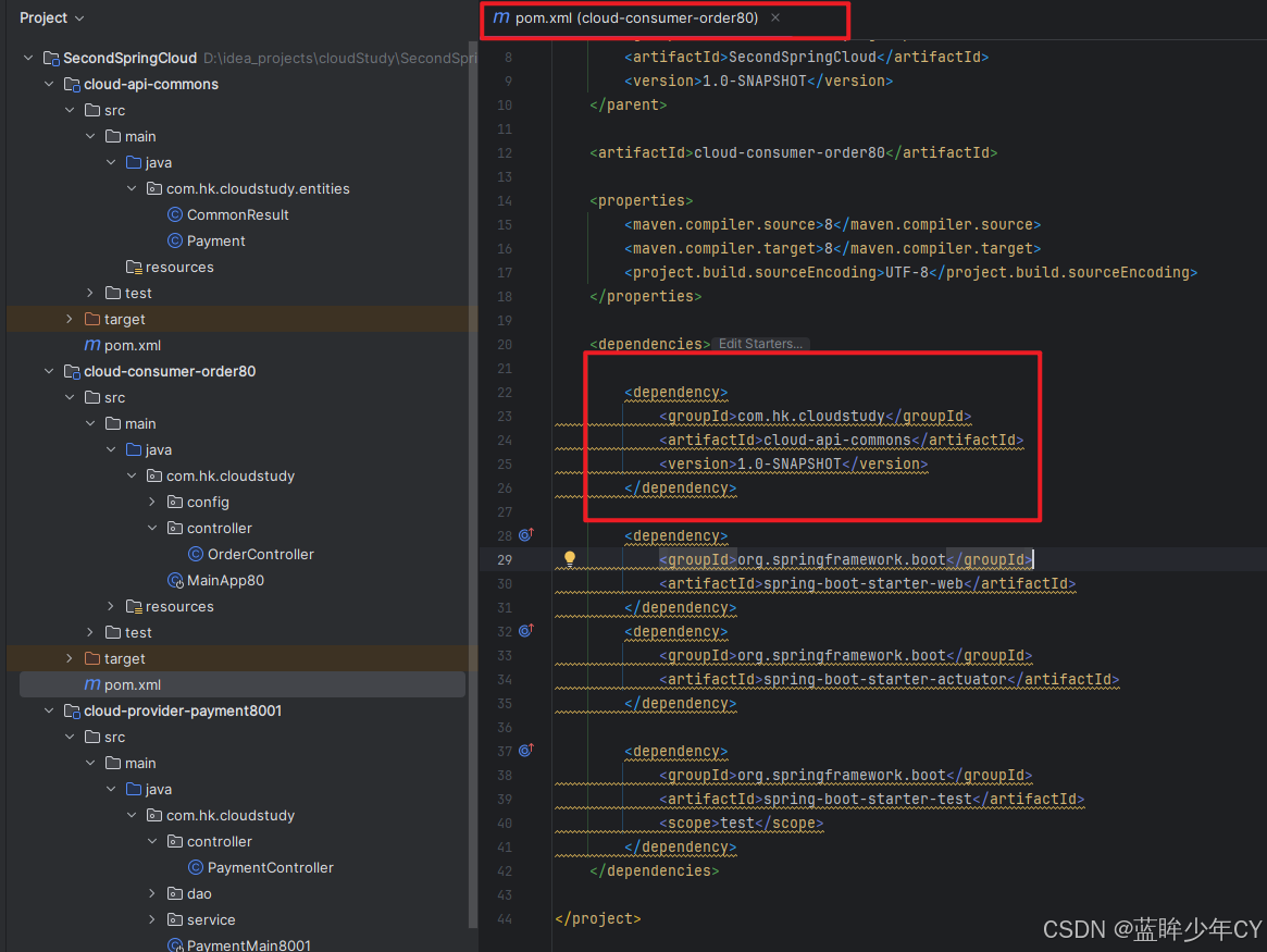 - 在80和8001的pom中加入cloud-api-commons依赖,并且移除spring-boot-devtools和lombok依赖hou