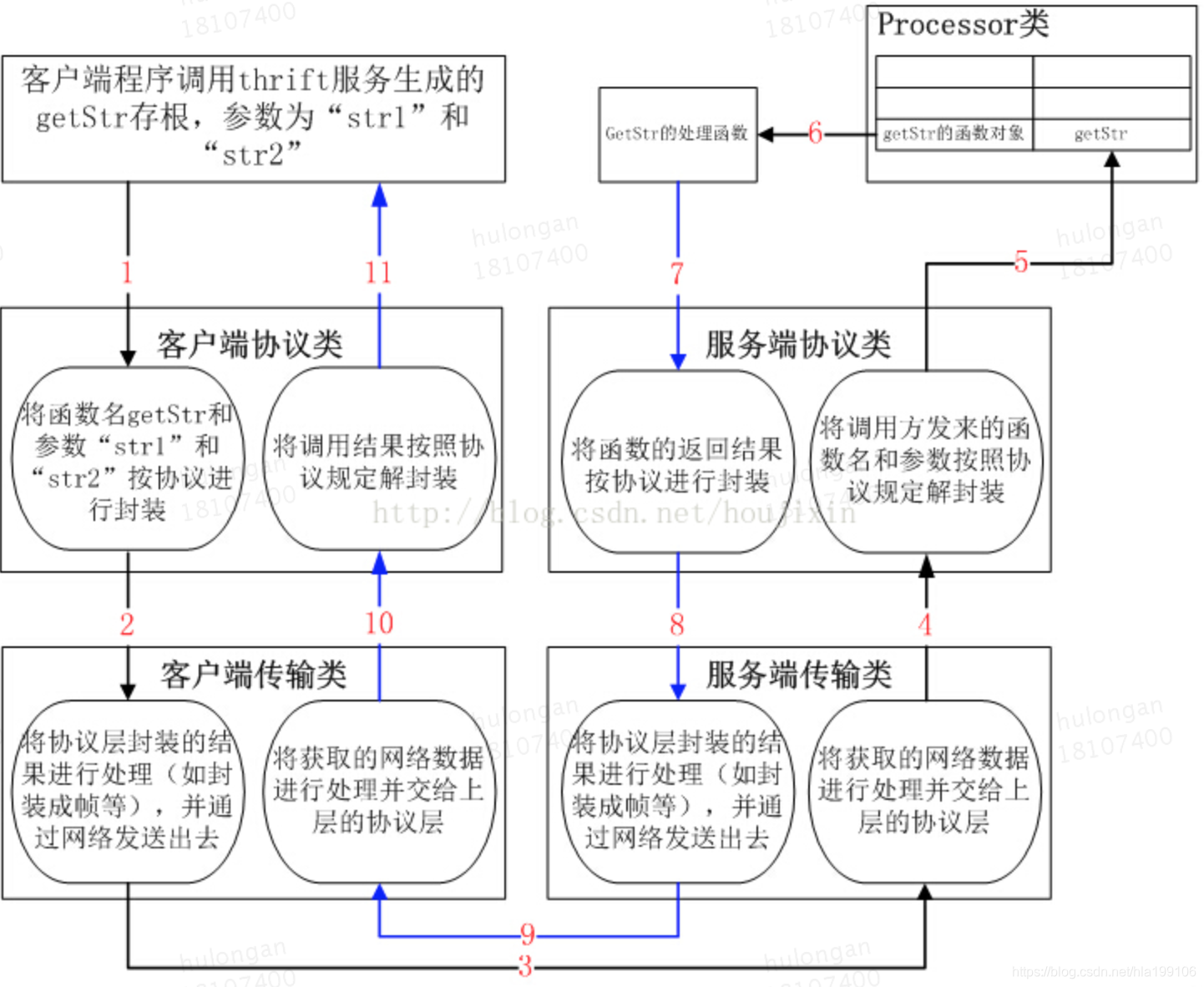 | Thrift的工作原理 参考: https://blog.youkuaiyun.com/houjixin/article/details/42779835 | RPC的调用方和被调用方不在同一个进程内,甚至都不在同一台机子上,涉及网络传输 涉及到的三个类 协议类(TProtocol) 传输层(TTransport) 处理类(Processor)