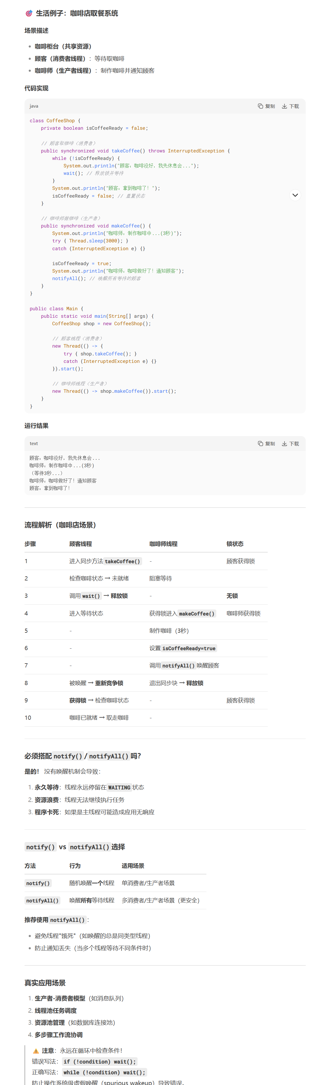 notify()或notifyAll()唤醒它。核心作用是实现线程间的协调通信