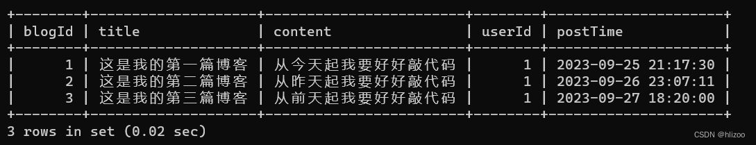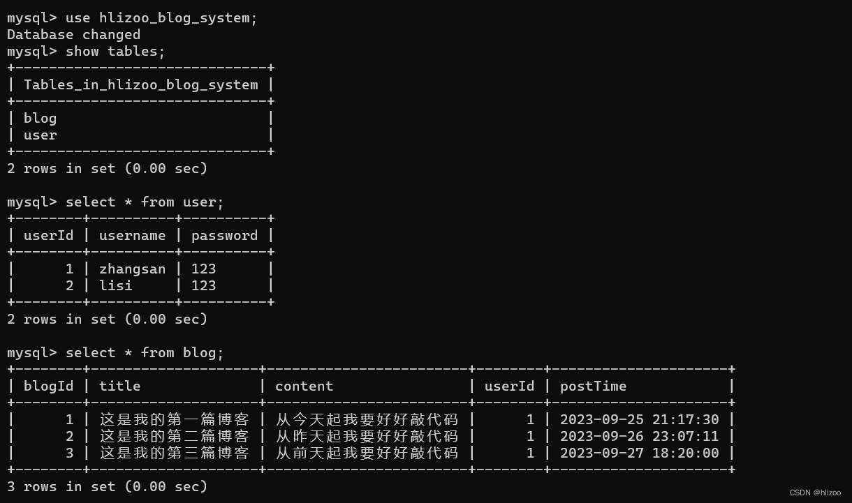 -- 在此文件下编写SQL完成建库建表操作 -- 创建数据库 create database if not exists hlizoo_blog_system charset utf8; use hlizoo_blog_system; -- 创建两个表,一个博客表,一个表示用户表 -- 博客表用来管理博客,用户表用来管理用户 -- 我们一般的操作会先删表再重新创建,防止之前的表的数据对我们产生不好的影响 drop table if exists user; drop table if exists blog; create table blog( -- 博客的编号 blogId int primary key auto_increment, -- 博客的标题 title varchar(256), -- 博客的内容 content varchar(4096), -- 博客的作者 userId int, -- 博客的发布时间 postTime datetime ); create table user ( -- 用户编号 userId int primary key auto_increment, -- 用户名, 约定用户名不能重复. username varchar(64) unique, -- 密码 password varchar(64) -- user 里还可以增加很多别的属性. github 链接, 头像链接..... ); -- 构造一些初始数据,方便后续的测试 insert into user values(1, 'zhangsan', '123'), (2, 'lisi', '123'); insert into blog values(1,'这是我的第一篇博客','从今天起我要好好敲代码',1,'2023-9-25 21:17:30'); insert into blog values(2,'这是我的第二篇博客','从昨天起我要好好敲代码',1,'2023-9-26 23:07:11'); insert into blog values(3,'这是我的第三篇博客','从前天起我要好好敲代码',1,'2023-9-27 18:20:00');