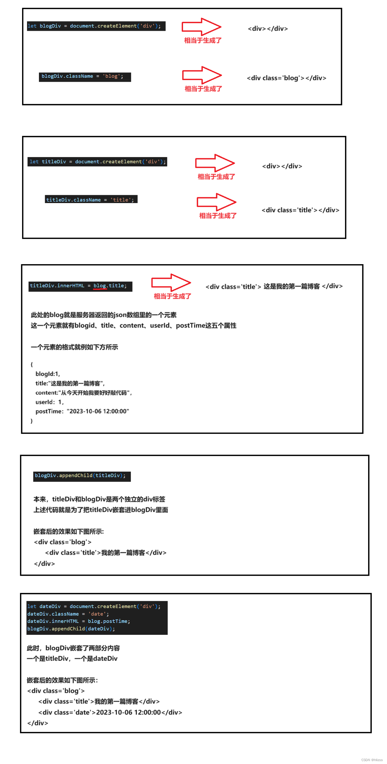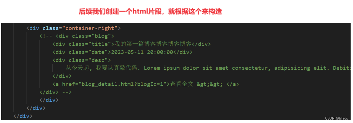 <!-- 右侧信息 --> <div class="container-right"> <!-- <div class="blog"> <div class="title">我的第一篇博客博客博客博客</div> <div class="date">2023-05-11 20:00:00</div> <div class="desc"> 从今天起, 我要认真敲代码. Lorem ipsum dolor sit amet consectetur, adipisicing elit. Debitis repellendus voluptatum, reiciendis rem consectetur incidunt aspernatur eveniet excepturi magni quis sint, provident est at et pariatur dolorem aliquid fugit voluptatem. </div> <a href="blog_detail.html?blogId=1">查看全文 >> </a> </div> --> </div> </div> </div> <script src="https://code.jquery.com/jquery-3.7.1.min.js"></script> <script> //编写JS代码 //构造ajax请求向服务器获取到博客列表数据,然后接收服务器返回的响应并展示到页面上 function getBlogs(){ $.ajax({ type:'get', url:'blog', success:function(body){ //在这里根据响应的内容,构造出html片段,展示到页面上 //由于在服务器响应中已经设置了Content-Type为application/json //此时jQuery就能够自动把此处响应的内容解析成js对象数组 let container = document.querySelector('.container-right'); for(let blog of body){ //这个for循环就相当于Java里的for-each循环 //根据当前这个blog,构造出一个html片段 //构造的格式按上面注释部分来 //构造blog的div标签 let blogDiv = document.createElement('div'); blogDiv.className = 'blog'; //第一步:构造标题 let titleDiv = document.createElement('div'); titleDiv.className = 'title'; titleDiv.innerHTML = blog.title; blogDiv.appendChild(titleDiv); //第二步:构造发布时间信息 let dateDiv = document.createElement('div'); dateDiv.className = 'date'; dateDiv.innerHTML = blog.postTime; blogDiv.appendChild(dateDiv); //第三步:构造内容摘要信息 let descDiv = document.createElement('div'); descDiv.className = 'desc'; descDiv.innerHTML = blog.content; blogDiv.appendChild(descDiv); //第四步:构造“查看全文”点击链接按钮 let a = document.createElement("a"); a.href = 'blog_detail.html?blogId=' + blog.blogId; a.innerHTML = '查看全文 >>'; blogDiv.appendChild(a); //最后一步:将拼好的blogDiv添加到container container.appendChild(blogDiv); } } }) } getBlogs(); </script>
