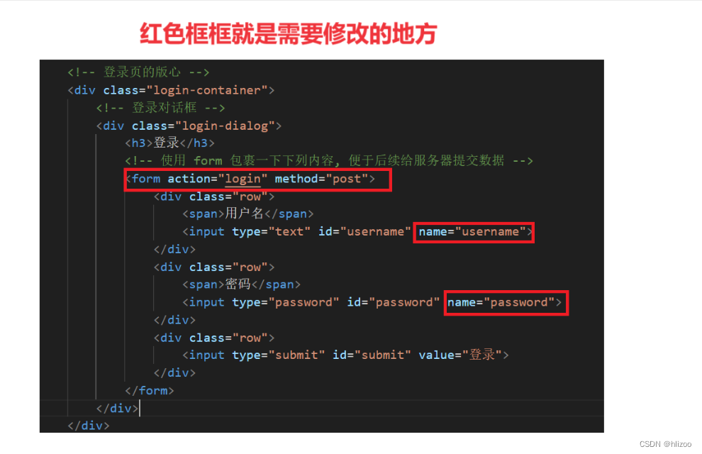 <!-- 登录页的版心 --> <div class="login-container"> <!-- 登录对话框 --> <div class="login-dialog"> <h3>登录</h3> <!-- 使用 form 包裹一下下列内容, 便于后续给服务器提交数据 --> <form action="login" method="post"> <div class="row"> <span>用户名</span> <input type="text" id="username" name="username"> </div> <div class="row"> <span>密码</span> <input type="password" id="password" name="password"> </div> <div class="row"> <input type="submit" id="submit" value="登录"> </div> </form> </div> </div>