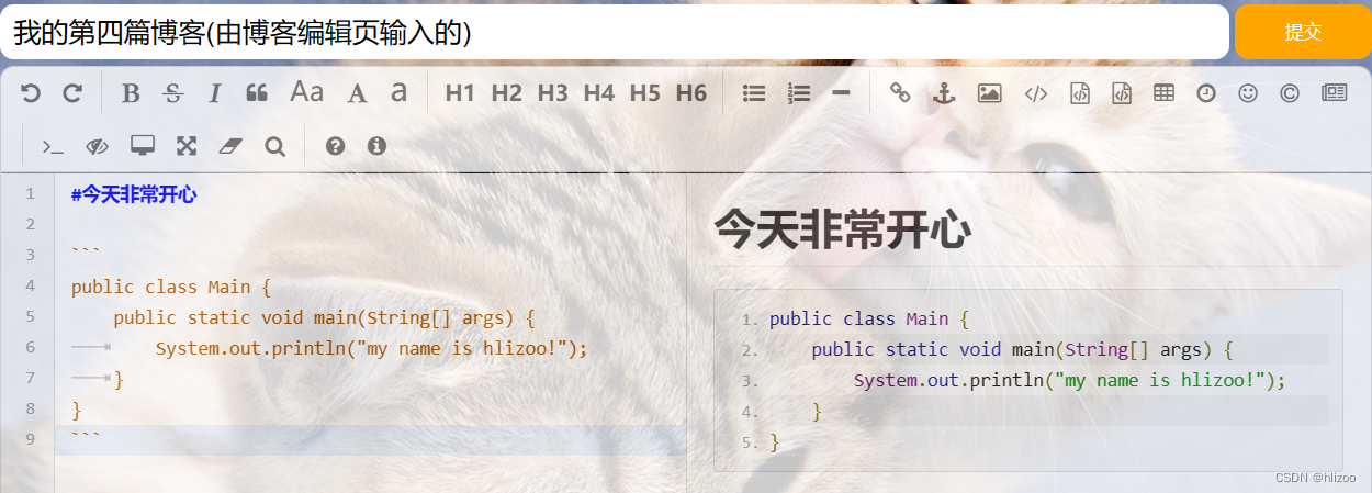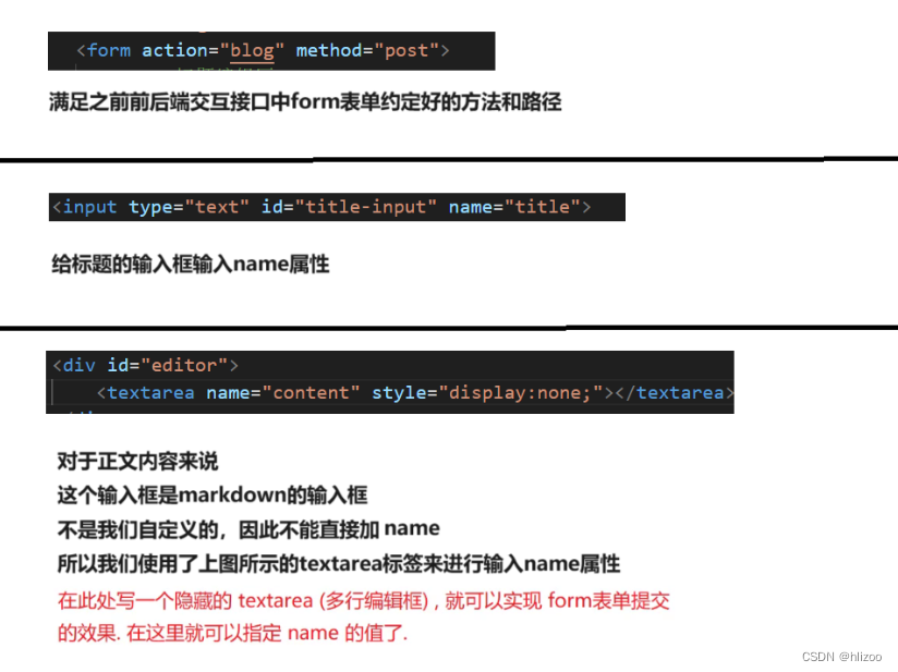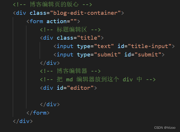 <!-- 博客编辑页的版心 --> <div class="blog-edit-container"> <form action="blog" method="post"> <!-- 标题编辑区 --> <div class="title"> <input type="text" id="title-input" name="title"> <input type="submit" id="submit"> </div> <!-- 博客编辑器 --> <!-- 把 md 编辑器放到这个 div 中 --> <div id="editor"> <textarea name="content" style="display:none;"></textarea> </div> </form> </div>