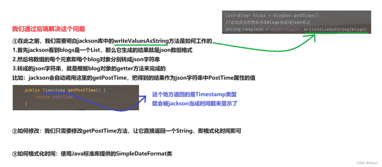 import java.text.SimpleDateFormat; import java.util.Date; //SimpleDateFormat使用步骤 public class date { public static void main(String[] args) { //(1)先创建SimpleDateFormat对象,指定日期格式 SimpleDateFormat sdf = new SimpleDateFormat("yyyy-MM-dd HH:mm:ss"); //(2)format()方法将当前日期格式化为指定格式的字符串 Date date = new Date(); String formattedDate = sdf.format(date); System.out.println("格式化后的日期:" + formattedDate); } }🔯4.在dao包下的Blog文件中修改getPostTime()方法