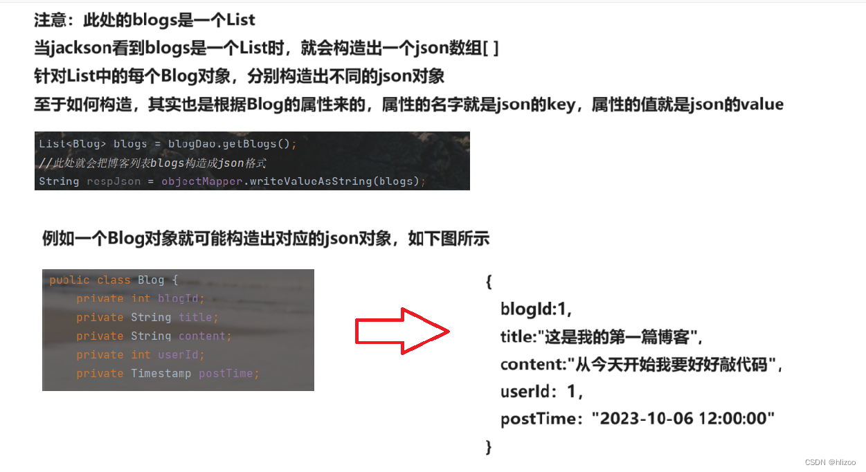 package api; import com.fasterxml.jackson.databind.ObjectMapper; import dao.Blog; import dao.BlogDao; import javax.servlet.ServletException; import javax.servlet.annotation.WebServlet; import javax.servlet.http.HttpServlet; import javax.servlet.http.HttpServletRequest; import javax.servlet.http.HttpServletResponse; import java.io.IOException; import java.util.List; //因为上述前后端交互接口中我们已经约定了方法是GET,路径是blog,因此这里我们得遵守约定 @WebServlet("/blog") public class BlogServlet extends HttpServlet { //定义ObjectMapper对象,这是jackson库,我们用它来解析或者组织JSON格式数据 private ObjectMapper objectMapper = new ObjectMapper(); @Override protected void doGet(HttpServletRequest req, HttpServletResponse resp) throws ServletException, IOException { //此处的工作:查询数据库,获取到数据库中的数据之后,构造成要求的json格式并返回 BlogDao blogDao = new BlogDao(); List<Blog> blogs = blogDao.getBlogs(); //此处就会把博客列表blogs构造成json格式 String respJson = objectMapper.writeValueAsString(blogs); //写到响应并返回 resp.setContentType("application/json;charset=utf8"); resp.getWriter().write(respJson); } }