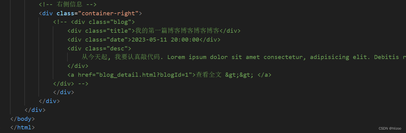 <!DOCTYPE html> <html lang="en"> <head> <meta charset="UTF-8"> <meta http-equiv="X-UA-Compatible" content="IE=edge"> <meta name="viewport" content="width=device-width, initial-scale=1.0"> <title>博客列表页</title> <link rel="stylesheet" href="css/common.css"> <link rel="stylesheet" href="css/blog_list.css"> </head> <body> <!-- 导航栏. nav 是 导航 这个词的缩写 --> <div class="nav"> <!-- logo --> <img src="image/logo2.jpg" alt=""> <div class="title">我的博客系统</div> <!-- 只是一个空白, 用来把后面的链接挤过去 --> <!-- 这是一个简单粗暴的写法~~ --> <div class="spacer"></div> <a href="blog_list.html">主页</a> <a href="blog_edit.html">写博客</a> <!-- 这里的地址回头再说 --> <a href="">注销</a> </div> <!-- 页面的主体部分 --> <div class="container"> <!-- 左侧信息 --> <div class="container-left"> <!-- 这个 div 表示整个用户信息的区域 --> <div class="card"> <!-- 用户的头像 --> <img src="image/kun.jpg" alt=""> <!-- 用户名 --> <h3>hlizoo</h3> <!-- github 地址 --> <a href="https://www.github.com">github 地址</a> <!-- 统计信息 --> <div class="counter"> <span>文章</span> <span>分类</span> </div> <div class="counter"> <span>2</span> <span>1</span> </div> </div> </div> <!-- 右侧信息 --> <div class="container-right"> <!-- <div class="blog"> <div class="title">我的第一篇博客博客博客博客</div> <div class="date">2023-05-11 20:00:00</div> <div class="desc"> 从今天起, 我要认真敲代码. Lorem ipsum dolor sit amet consectetur, adipisicing elit. Debitis repellendus voluptatum, reiciendis rem consectetur incidunt aspernatur eveniet excepturi magni quis sint, provident est at et pariatur dolorem aliquid fugit voluptatem. </div> <a href="blog_detail.html?blogId=1">查看全文 >> </a> </div> --> </div> </div> </div> <!-- 引入 ajax 的依赖 --> <script src="https://code.jquery.com/jquery-3.7.1.min.js"></script> <!-- 引入 editor.md 的依赖 --> <link rel="stylesheet" href="editor.md/css/editormd.min.css" /> <script src="editor.md/lib/marked.min.js"></script> <script src="editor.md/lib/prettify.min.js"></script> <script src="editor.md/editormd.js"></script> <!-- 引入 app.js,判断是否登录 --> <script src="js/app.js"></script> <script> //编写JS代码 //构造ajax请求向服务器获取到博客列表数据,然后接收服务器返回的响应并展示到页面上 function getBlogs(){ $.ajax({ type:'get', url:'blog', success:function(body){ //在这里根据响应的内容,构造出html片段,展示到页面上 //由于在服务器响应中已经设置了Content-Type为application/json //此时jQuery就能够自动把此处响应的内容解析成js对象数组 let container = document.querySelector('.container-right'); for(let blog of body){ //这个for循环就相当于Java里的for-each循环 //根据当前这个blog,构造出一个html片段 //构造的格式按上面注释部分来 //构造blog的div标签 let blogDiv = document.createElement('div'); blogDiv.className = 'blog'; //第一步:构造标题 let titleDiv = document.createElement('div'); titleDiv.className = 'title'; titleDiv.innerHTML = blog.title; blogDiv.appendChild(titleDiv); //第二步:构造发布时间信息 let dateDiv = document.createElement('div'); dateDiv.className = 'date'; dateDiv.innerHTML = blog.postTime; blogDiv.appendChild(dateDiv); //第三步:构造内容摘要信息 let descDiv = document.createElement('div'); descDiv.className = 'desc'; descDiv.innerHTML = blog.content; blogDiv.appendChild(descDiv); //第四步:构造“查看全文”点击链接按钮 let a = document.createElement("a"); a.href = 'blog_detail.html?blogId=' + blog.blogId; a.innerHTML = '查看全文 >>'; blogDiv.appendChild(a); //最后一步:将拼好的blogDiv添加到container container.appendChild(blogDiv); } } }) } getBlogs(); checkLogin(); </script> </body> </html>(2)博客详情页blog_detail.html