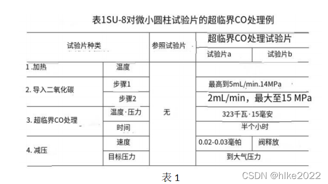 表1表示超临界CO2处理条件的例子。 在本例中,将SU―8微小圆柱试验片的基板分成两部分,在相同条件下进行超临界CO2处理后,分别在不同条件下进行减压工序。